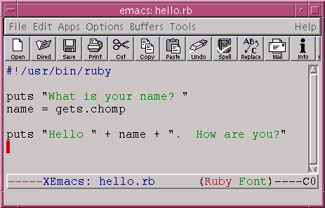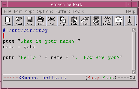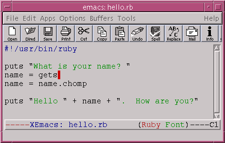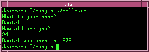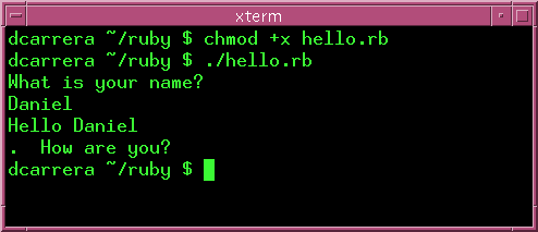 Let's make the program that greets the user. We will ask the user for his or her name, and then say 'hello'. We use the gets method to get the user input (as a string).