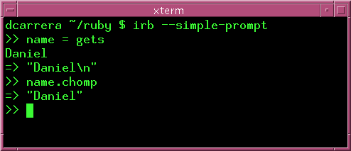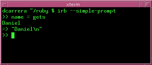 This will make more sense if we bo back to irb. Start irb and type the gets line. When the computer waits for the input type in a name. Look carefully at what happens: